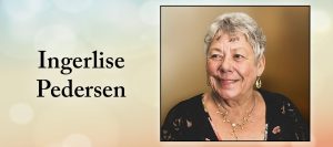 Ingerlise was born in December of 1941 in Ronde, Denmark. She was predeceased by her beloved husband of 54 years, Karl Pedersen in December 2015.