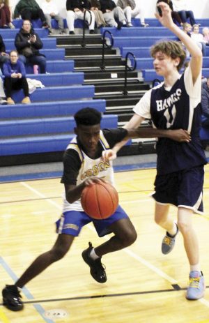 Omar Dunkley, in white of the Willow Creek Composite High School junior high “A” boys’ basketball team works gainst a Pincher Creek defender under the basket in a post-season playoff game on Saturday, Feb. 14. For full coverage please see page 16. Photo by Rob Vogt