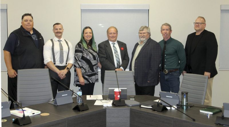 The recently elected mayor and council for the Town of Claresholm was sworn in at a ceremony in council champers on Monday, Nov. 3. From left are Couns. Craig Zimmer; Seth Wagner; and Kandice Meister; Mayor Brad Schlossberger; and Couns. Rod Kettles; David Knox; and Kieth Carlson. For related story please see page two Photo by Rob Vogt