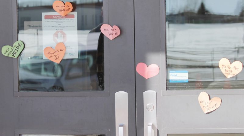 Heart-felt Support Staff at West Meadow Elementary School arrived at work on March 23, to see these uplifting messages posted on the front of the school. It was an anonymous gesture, coming after classes were cancelled for all Alberta schools for the rest of the school year on March 15. Photo by Rob Vogt