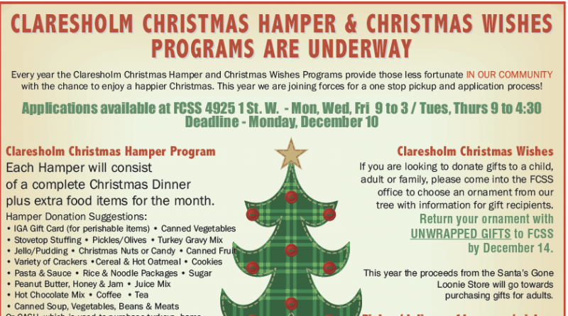 By Rob Vogt, Local Press Writer Several community organizations are partnering to maximize resources and help the most people they can with an updated Christmas wishes and hamper program. “We have a very generous community,” said Allison McKee, community outreach coordinator for Claresholm and District Family and Community Support Services. Several organizations including FCSS, the Claresholm Local Press, Claresholm Housing Authority, … Read more…